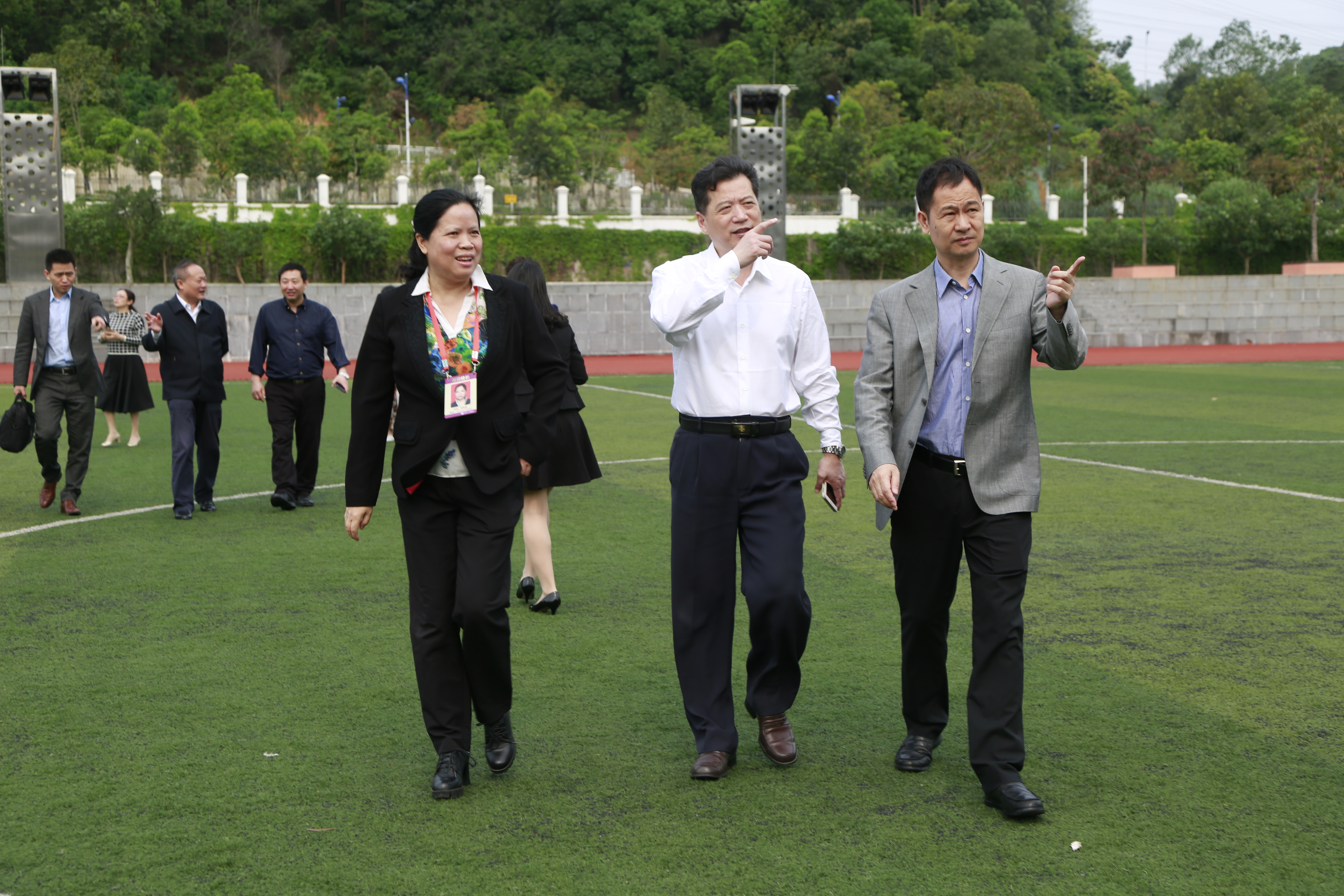 当天上午,华中师大彭南生副校长、教务处刘建清处长、合作办王志彬主任、教务邱宝国副处长等华中师大领导一行参观了华中师大龙岗附中的校园,对于学校一流的设施设备表示称赞;观看了学生们的阳光体育跑操,对于学生表现出的蓬勃朝气和严谨风貌表示惊叹。