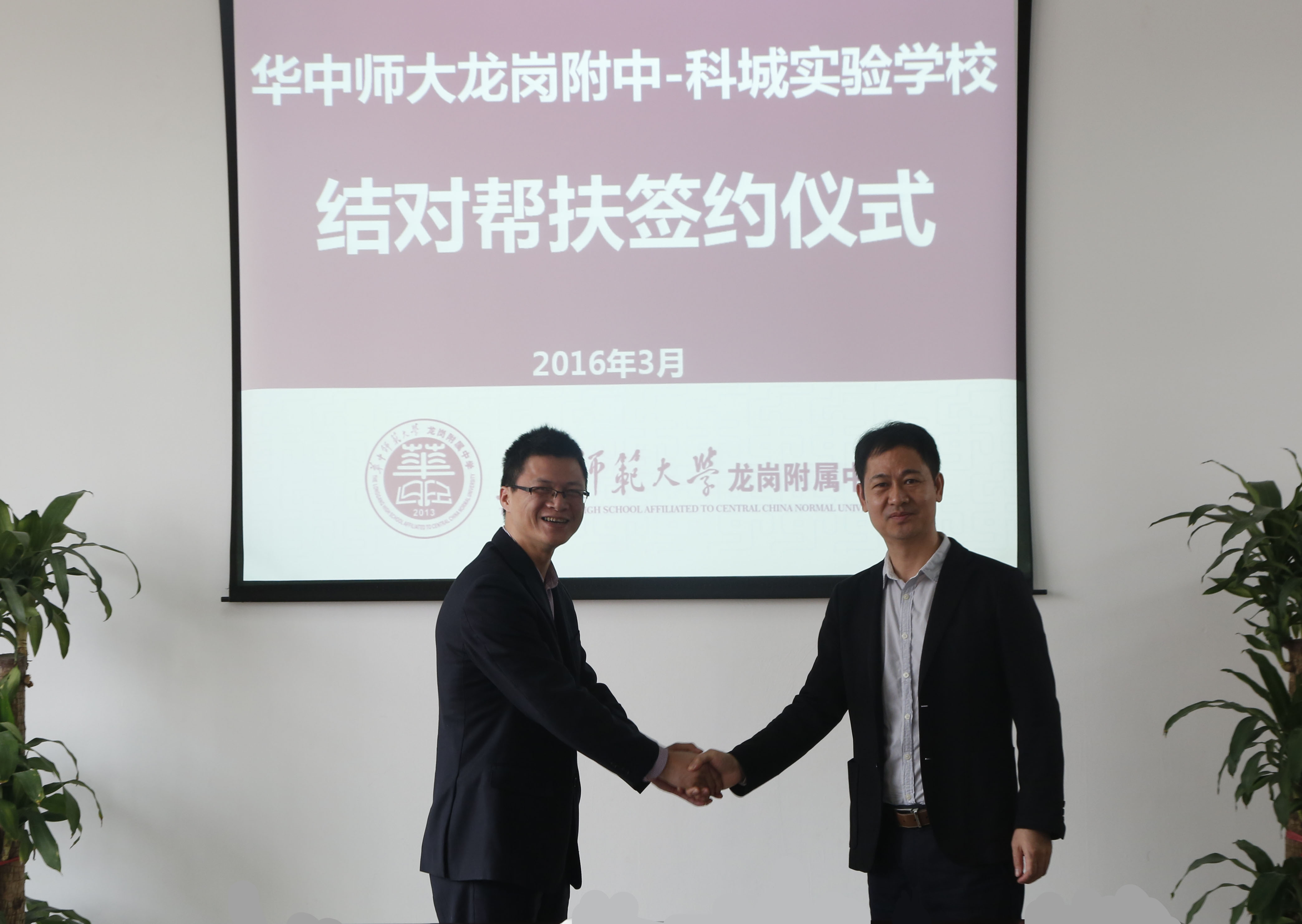 早上九点,科城实验学校张鹏飞校长率领高中部付丽影主任等一行五人造访华中师大龙岗附中参加了结对帮扶签约仪式。华中师大龙岗附中刘彩宾校长对客人们的到来表示热烈欢迎,为两校能结成对子表示振奋。刘校长简要介绍了华中师大龙岗附中的基本情况,陈述了学校办学秉承的教育理念、学校开办两年多以来的多彩实效活动和师生取得的优异成绩。刘校长认为布吉的民办教育占了龙岗区教育的半壁江山,对布吉乃至龙岗做出了巨大贡献。公办学校的条件更好,民办学校的管理和精神却更值得我们钦佩和学习。从培养学生的角度出发,公民办学校都有责任和义务加强融合和支持。两校的结对是一种缘分,是结成发展的共同体、发展同盟,两所学校可以取长补短,通过结对追求高位的均衡优质发展。刘校长建议两所学校创造性地开展结对工作——教师互派,学生结对,同伴互助成长。扎扎实实的结对活动最终产生作用和效果,会落实到学生身上。今天的签约仪式是一个开端,今后的结对帮扶两校会携手一步一个脚印走好。张鹏飞校长介绍了科城实验学校2004年9月开办以来学校的发展情况,科城实验学作为省一级学校,在规范化办学、品牌化建设上不断探索,高中规模不断扩大,高考质量也跨越提升。但是学校2011年才开始开办高中班,缺少高中管理经验。本次龙岗区安排的结对帮扶活动,让学校多一份学习机会,多一个成长空间。