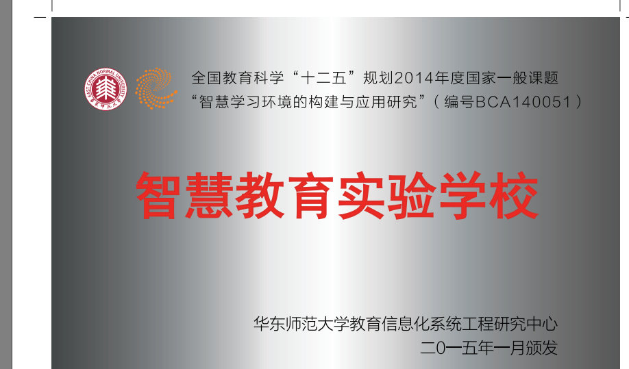 2015年11月4日,全国教育科学“十二五”规划2014年度国家级课题“智慧学习环境的构建与应用研究”课题组认定我校为该课题研究实验学校。这是对我校近年来倾力打造智慧课堂,建设数字化学习资源库工作的认可。