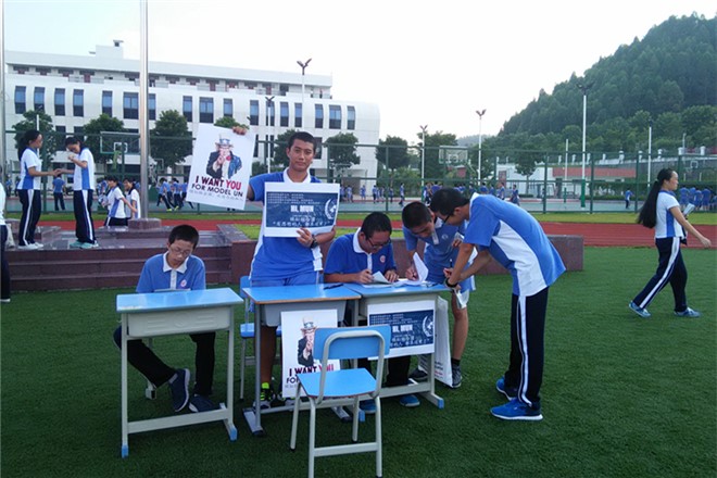 如“百团大战”,“全人发展”青少年领袖培训计划,“重走红军路——高二学生社会实践活动”,“铭记历史·唱响青春”红歌大赛,“百人巨幅油画创作”及贺岁杯级际篮球赛等活动,形式新颖别致,内容丰富多姿,确保了参与人数最大化,眼球效应最大化,教育效果最大化的德育工作成效。