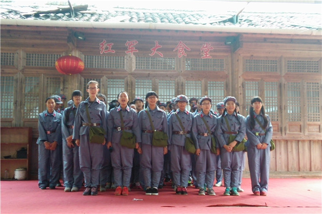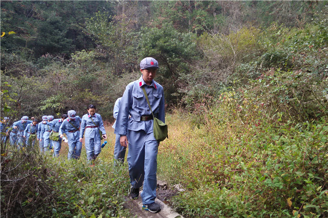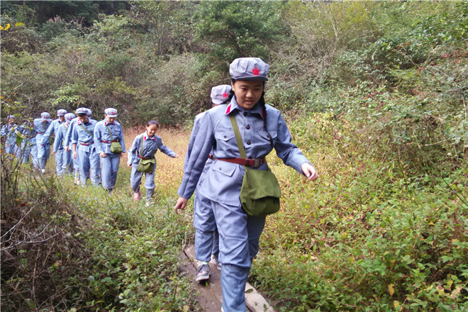 下午,“小红军”们接受了一个重要的挑战——重走一段长征路。起初,当他们了解到这次“重走”只有一个小时的路程时,不少“小红军”们流露出失望的神情。“才一个小时的路程,肯定和爬山没什么区别,真没意思”,刘同学自信地说。可当他们逐步走入森林时,这种失望就烟消云散了。原来,这段路距离虽然不远,但并没有太多“台阶式”的山路,道路泥泞,不少小溪水上方只有一块木板,也有很多地方需要“跳”下去,或者“爬”上来。“我感觉这段路不太好走,气候潮湿路面很滑,很多地方还不得不慢慢行走,真不敢想象当年红军长时间呆在这样的山里是怎么度过的”,王同学说,“虽然只走了这么一会儿,但是当年长征的艰难是可想而知了,我真的很佩服当年的红军们。”行进途中,很多团队开始自发地唱起了红歌,嘹亮的歌声响彻山林,透着青春的激情,给人团结与奋进的力量。