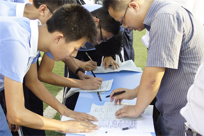 9月23日下午5时,华附“百团大战”社团联合招新活动在大操场打响“第一枪”。绿茵茵的足球场周围整齐地摆放着56个社团摊位,高一、高二年级倾巢出动,同学们兴奋地奔向自己心仪的社团。