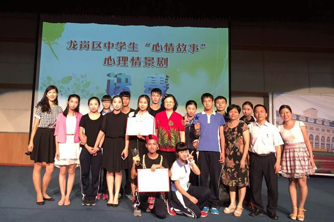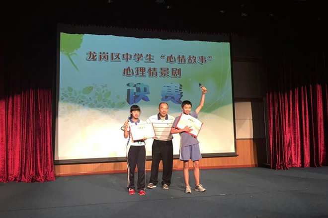 6月12日下午2:30,龙岗区中学生“心情故事”心理情景剧决赛在新亚洲学校一楼报告厅举行,经过初赛选拔,12个原创剧目从37个学校代表作中脱颖而出,参加决赛。华中师大龙岗附中原创心理剧《恋非恋》选取“早恋”这一敏感话题,深刻挖掘了高中生“早恋”背后的家庭原因,现场“走心”的演绎打动评委和观众,以高中组第一名的成绩斩获一等奖,剧中“乔昊天”的扮演者李毓茂同学凭幽默搞笑的演绎风格获得“最佳表演奖”。