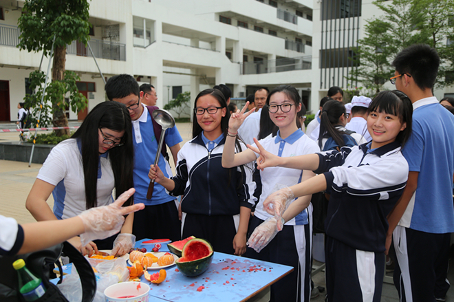5月8日下午4时,蓝天白云下的华中师大龙岗附中前广场热闹非凡,师生家长济济一堂,共同参与“母亲节系列活动之创意水果拼盘献母亲”活动。35张桌子在前广场依次排开, 31个学生“创意大厨代表队”、2个青年教师代表队1支生活老师代表队和1个食堂大厨代表队开始制作各式各样的水果拼盘。西瓜、橙子、火龙果、圣女果、芒果等新鲜水果琳琅满目,“摇篮里的天使”“一直幸福吃到老”“芳馨伊人”“爱的抱抱”“人间四月天”等拼盘给人惊喜连连。其中,让人备受瞩目的是高二(9)班代表队制作的“吾之归宿——母亲”,“为了这个拼盘,我们班同学都是蛮拼的,”队员们说,“我们用苹果堆出了母亲和女儿,她们幸福地躺在圣女果、西瓜和橙子堆成的鲜花丛中,我们真心希望我们能和母亲一直这么幸福地生活下去。”